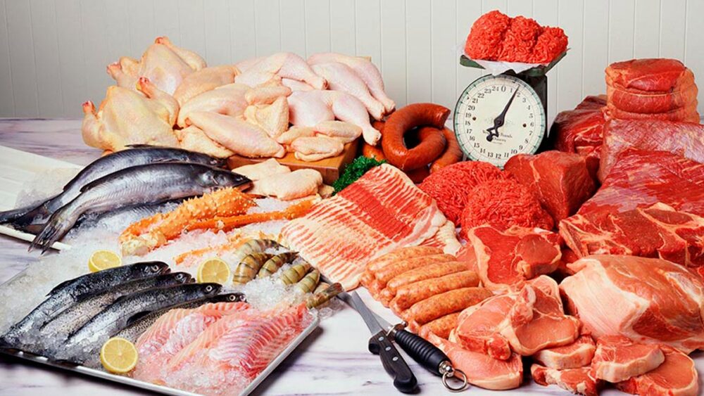Res, puerco, pollo y mariscos